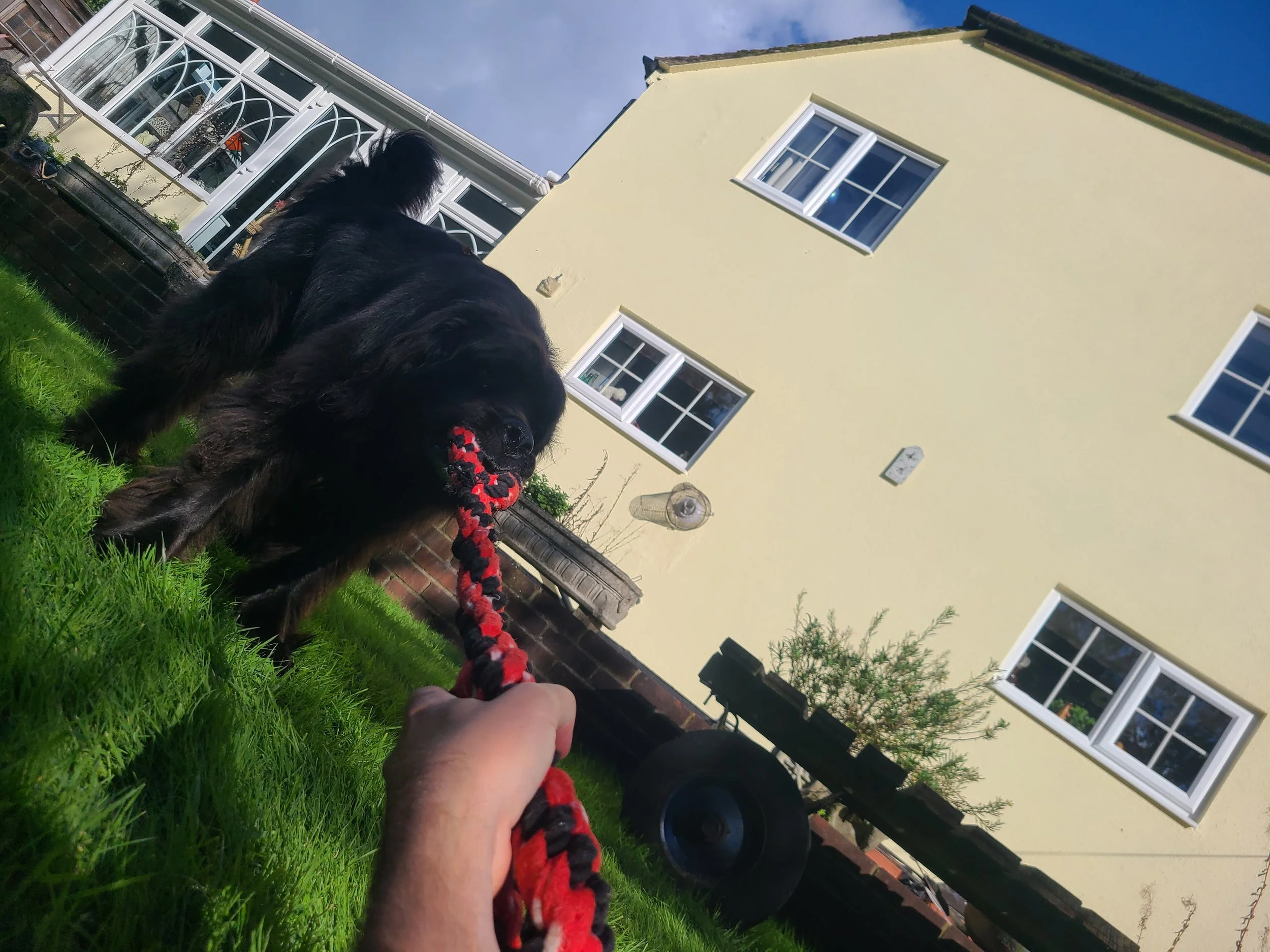 So fast forward 35 years and I still think of him when I’m looking to be creative. Play is like a dance and Peaches (a Newfoundland) definitely has a genetic predisposition to want to pull and play tug. We play loads of games like this and she adores it.