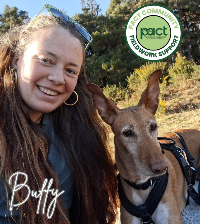 Buffy (she/her) is an ABTC Animal Training Instructor and Animal Behaviour technician and full member of PACT. Coming from a background in ecology and wildlife conservation, she now works in the dog rescue and rehoming sector as well as running a dog training business with her work and life buddy Gee.