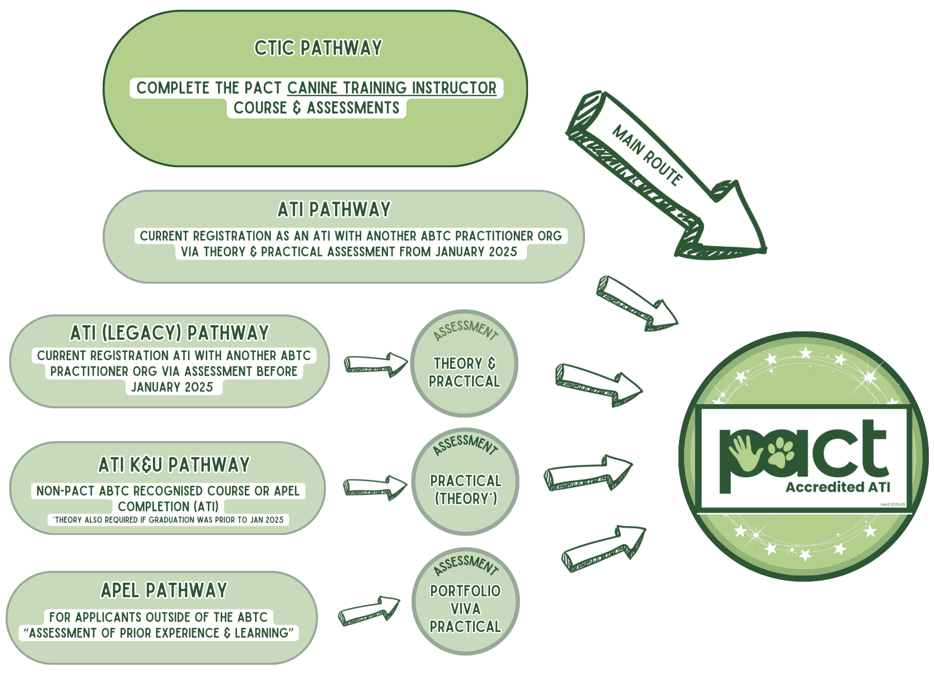 Accreditation via successful completion of the PACT Canine Training Instructor Course (CTIC) which includes both the K&U and PS assessments.